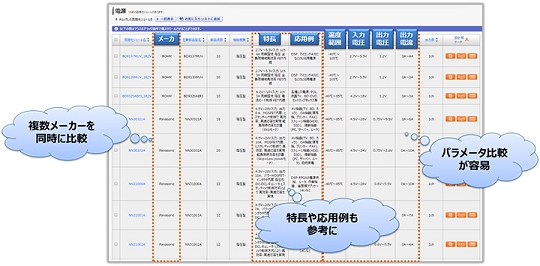 検索を実行すると、検索キーにヒットした回路モジュールが一覧で表示されます。この一覧では、複数メーカの回路モジュールの設計パラメータや特長、応用例などを同時に比較することが可能です。