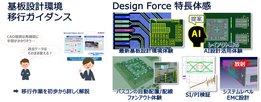 | 内容 | プログラム: 1. Board Designerからの移行ガイダンス 2. 従来CADを凌駕する【最新基板設計環境】 3. 自動ツールの利活用でさらなる時短を【"新"自動配置・配線設計】 4. 解析を設計者に【マルチボードSI/PI/EMC設計】 5. お客様の基板データを用いた【自由操作体感】 ※ 各会場いずれも、1部署2名様までのお申し込みでお願いします。 ※ 同業他社様のご参加はご遠慮願います。 |