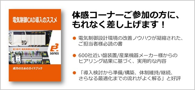 また、お客様自身がその場で効果を体験できる特別企画「E3.series自動化体感コーナー」をご用意しています。この機会に、DMS関西 図研ブースにお立寄りいただき、日ごろの電気設計の課題について、ご相談ください。