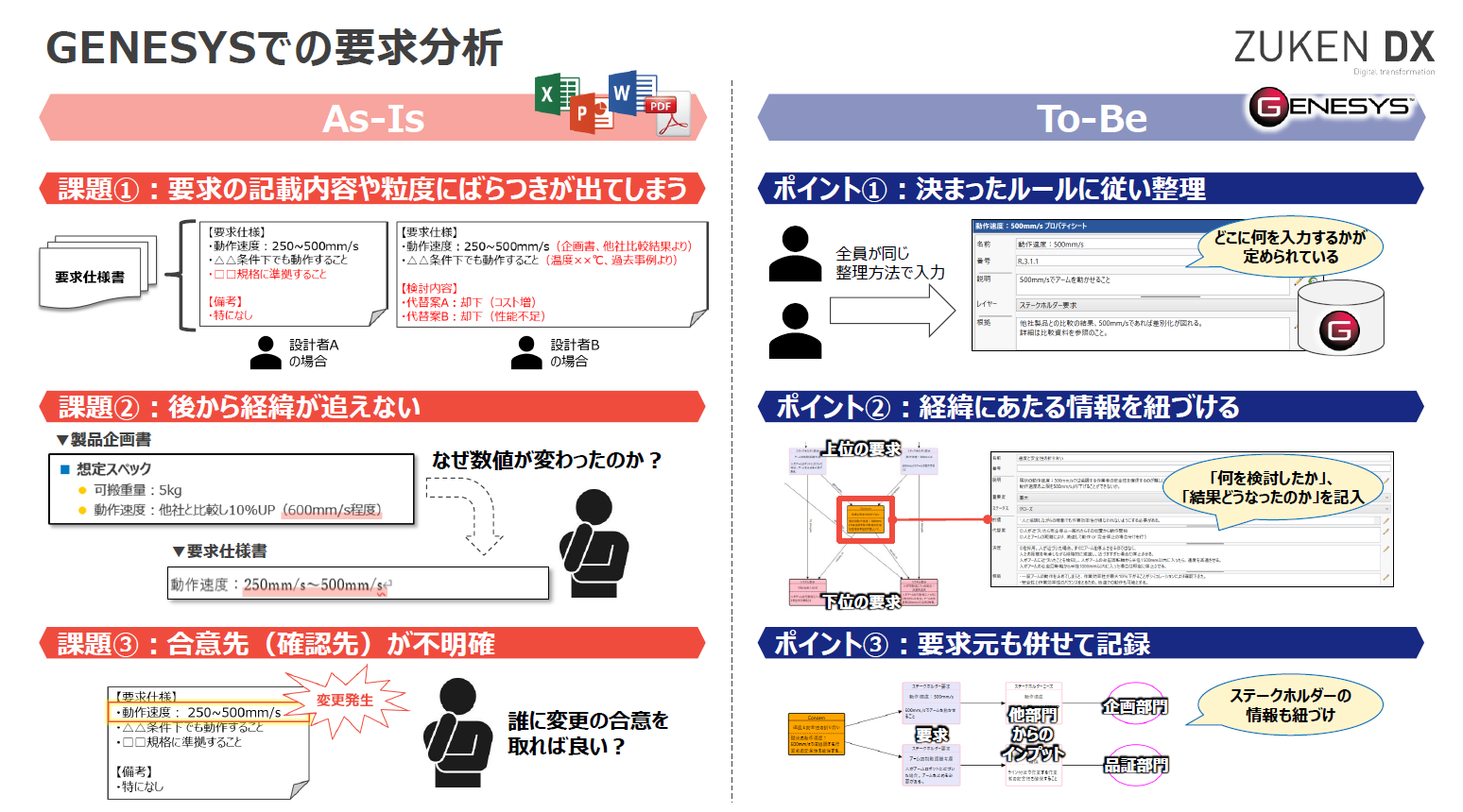 | 内容 | 1. 要求分析の現状 2. GENESYS での要求分析(操作ムービー) 3. コンサルティングメニューのご案内 |