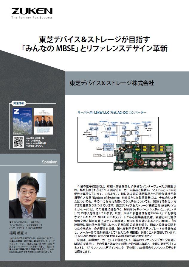 東芝デバイス&ストレージ株式会社(東芝デバイス&ストレージ)は、この課題に挑むべく、MBSE(モデルベース・システムズエンジニアリング)の導入を推進しています。以前、図研のお客様情報誌「from Z」でも取材させていただいたMBSE のエキスパートである福場義憲氏は、顧客との円滑な情報交換と製品開発プロセスの再構築にMBSE が有効であることに着目し、「設計開発に関わる全員が同じレベルでMBSE の知識を備え、顧客と設計者の間をつなぐ仕組み」の必要性を提唱。誰もが利用できる汎用テンプレートを多数作成し、メーカー間の共創基盤として「みんなのMBSE」を築くことを目指しています。(※「みんなのMBSE」についてはfrom Z vol28 巻頭対談もご参照ください)