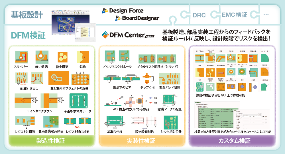 図研CAD との高い親和性はもちろんのこと、他社CAD で設計したデータでも、ODB++ や部品表などの設計成果物を利用して製造設計を行うことができます。 また、用途に応じた専門性の高い機能と、それを簡易操作で使用できるカスタマイズ環境により、基板製造準備、部品実装準備のいずれの製造設計も効果的に進めることができ、DFM 検証システムを活用することで歩留まり向上にも貢献できます。