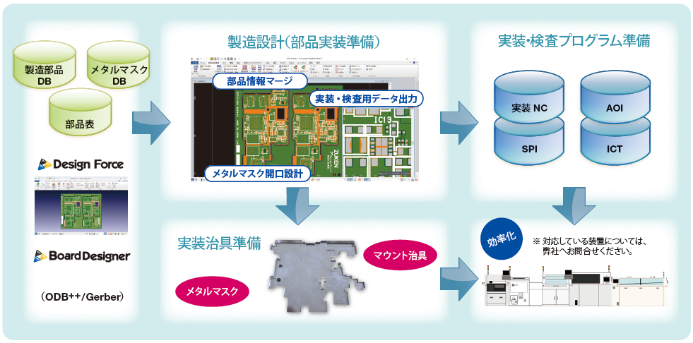 設計データの有効活用とユニークなCAM 編集機能により、メタルマスクのライブラリ運用、実装プログラム作成準備のオートメーション化を構築でき、実装準備業務のリードタイムの短縮、省人化・標準化(脱属人化)を支援します。