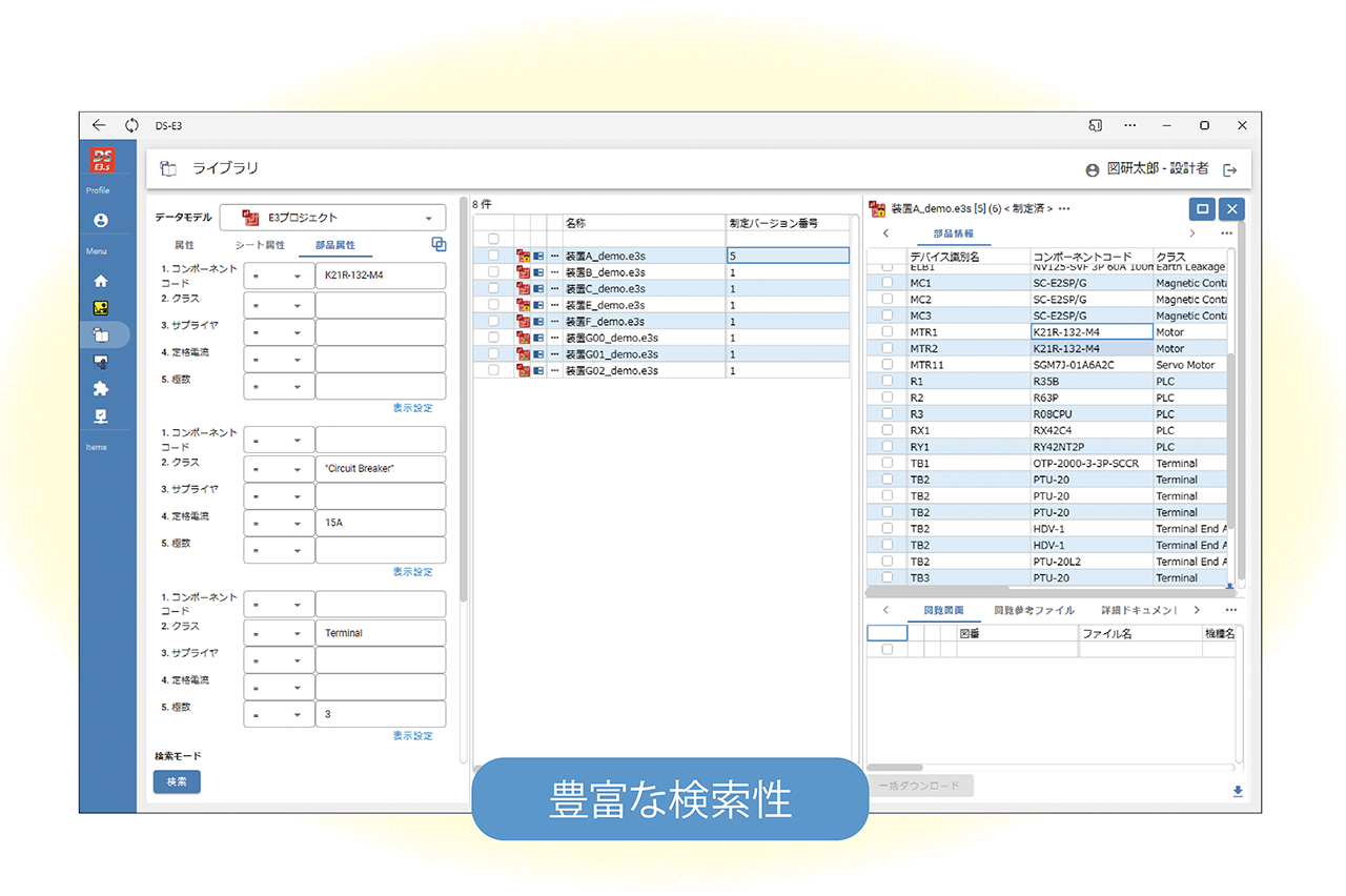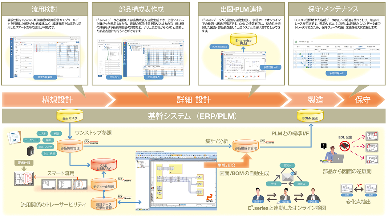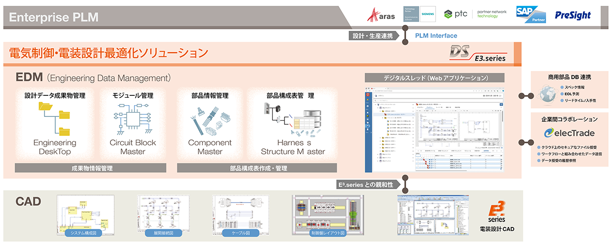 DS-E3は、図研の電気制御・ケーブル設計CADであるE3.series専用のデータマネジメントシステムとして、E3.seriesとの親和性を特長とし、E3.seriesから生成する各種図面、部品構成表(電気BOM)を、CADデータと紐づけて、仕掛段階から統合管理します。