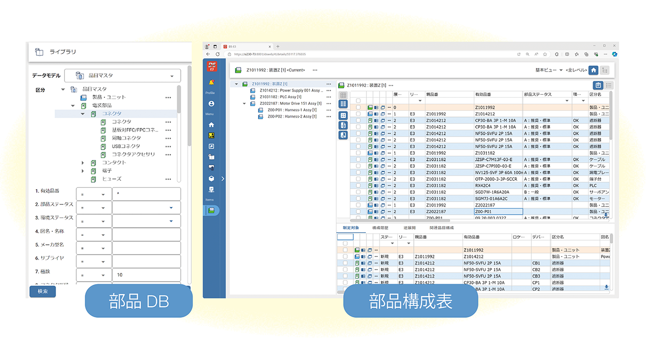 E3.series データと連動して部品構成表を自動生成でき、上位システムと繋がった部品DB から、最新の部品情報を取り込めるので、部材費の見積もりや長納期部品の対応など、より上流工程からCAD と連動した部品表設計を行うことができます。