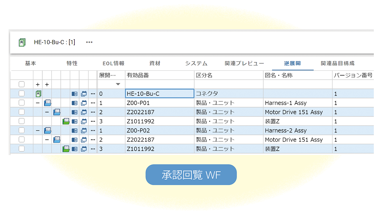 プロジェクト単位、シート単位、ハーネス単位などの製品構造に配慮した品目管理を実現し、過去の設計資産の有効活用や、設計変更時のトレーサビリティを確保します。