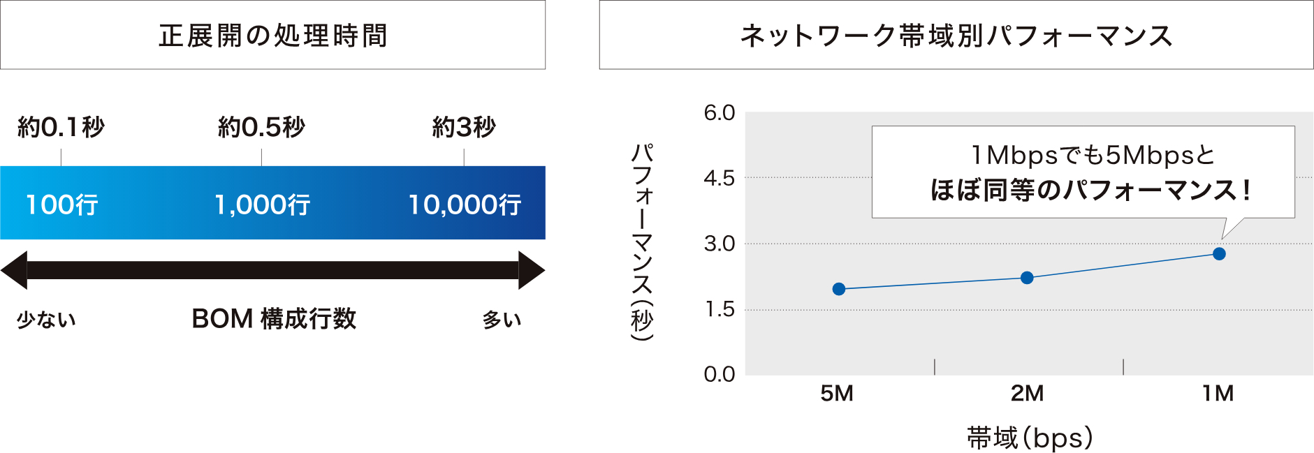 Visual BOMは、ユーザーの思考停止や業務停滞につながる速度低下を起こさないために、機能だけではなく、性能に注力して開発されています。構成行数が多いBOMの展開時間や、ネットワーク帯域が狭い環境下におけるシステム応答時間など、優れた高速性を実現しています。