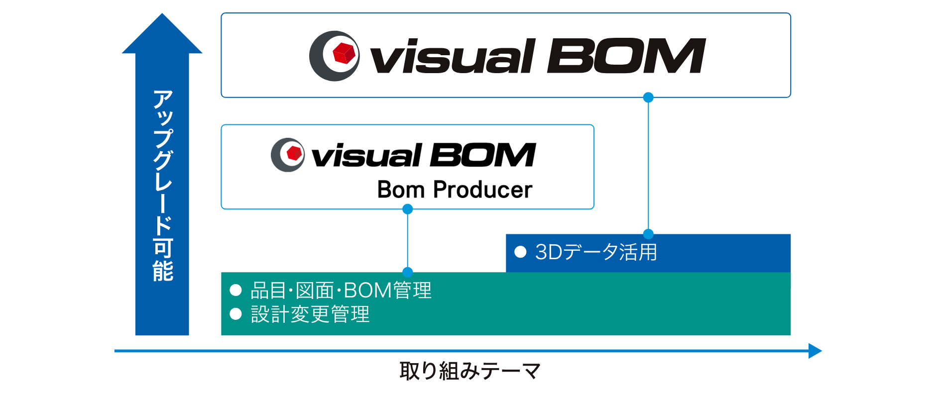 お客様の取り組みテーマに柔軟に対応するため、3Dデータ活用機能を除き、PLMソリューションとしての基本的な機能を提供する製品(Bom Producer)を用意しています。Bom Producer のデータ構造は Visual BOM と同じであり、機能はすべて Visual BOM にも実装されているため、製品ライセンスを変更するだけで Visual BOM にアップグレードすることが可能です。