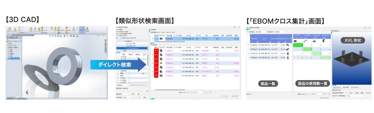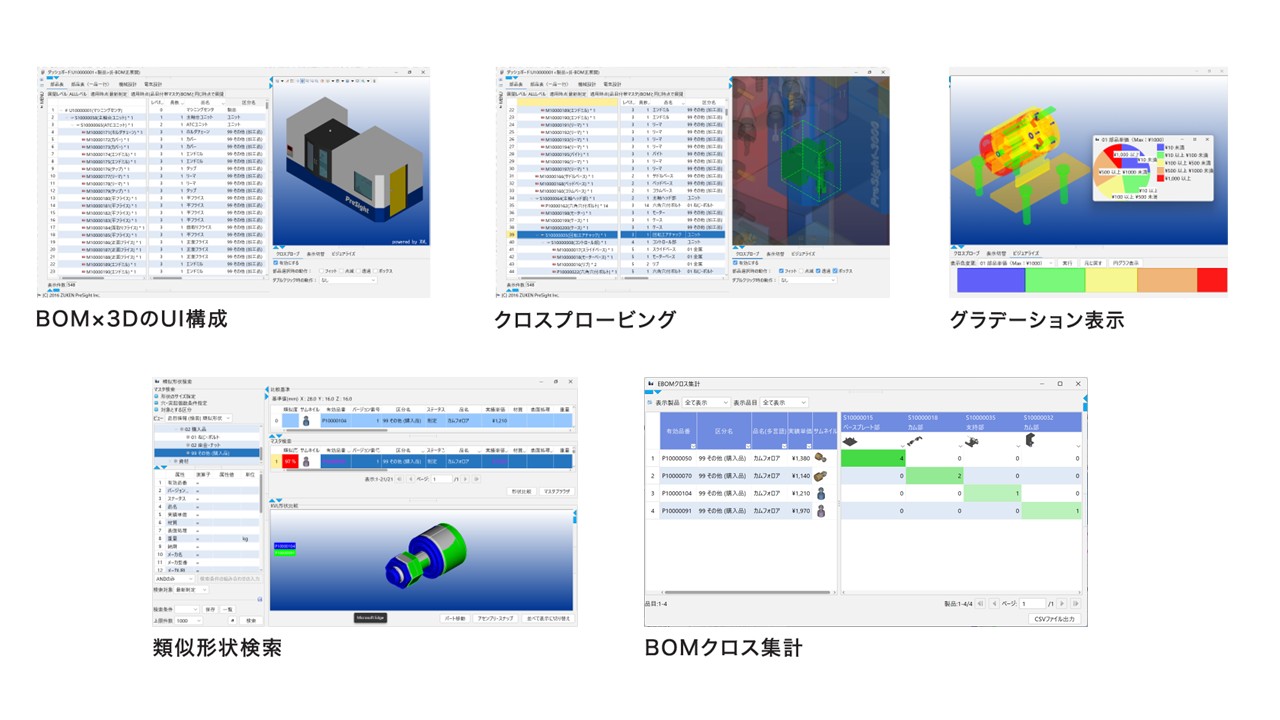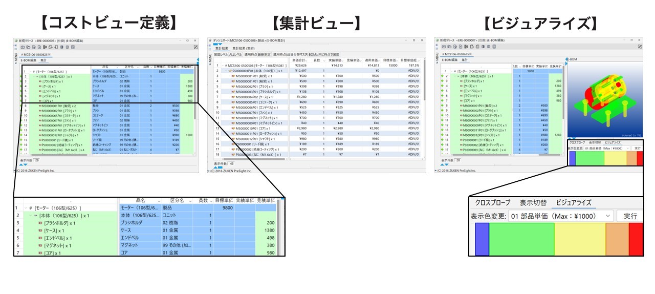 Visual BOMでは、設計仕掛段階の製品構成を関係する部門と共有できるため、コンカレントエンジニアリングによるコストダウンが可能になります。コスト情報のみを表示できるビュー機能、実績コストを考慮できる集計機能、コストごとに3D形状を色分けする機能、3D形状から類似部品を検索する機能により、高コスト部品の迅速な洗い出しや、代替部品検討を強力に支援します。