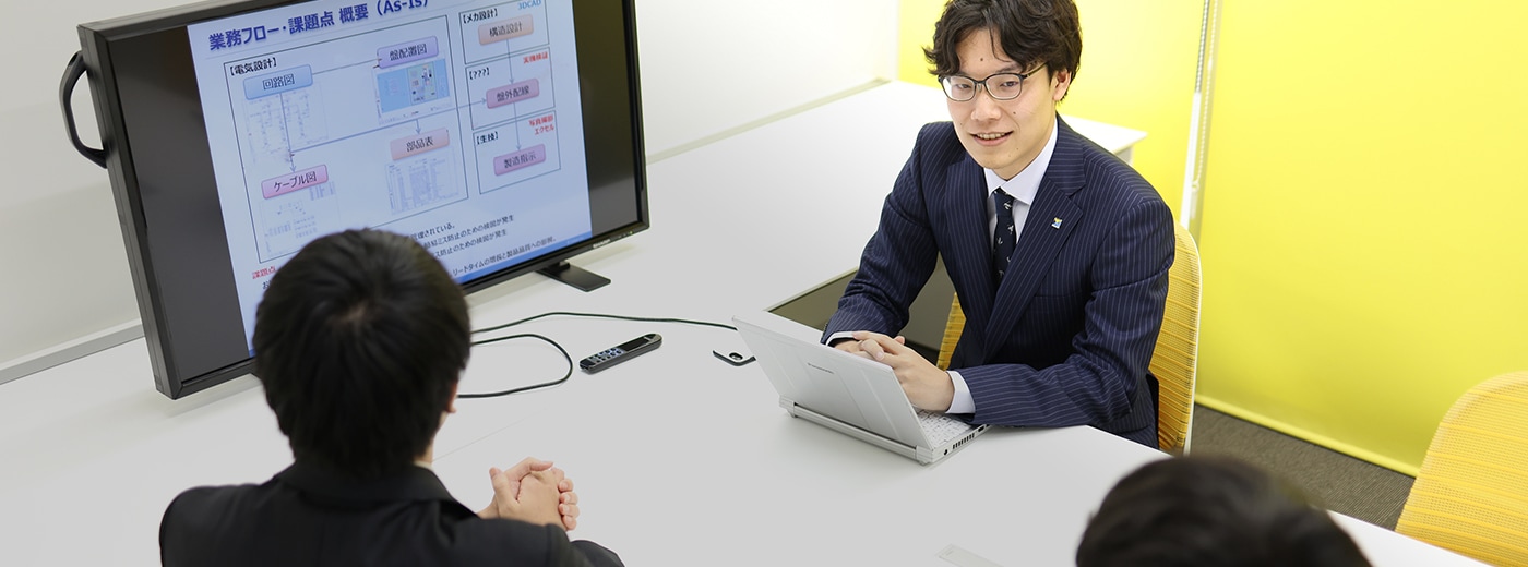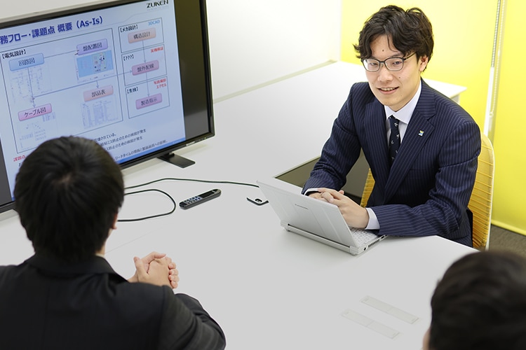 提案活動では営業職とSE職がチームになって進めますが、商談が進むにつれ、技術的な側面が強くなり、SE職の専門性と知識が必要とされるケースが多くなります。提案先で運用されている現状のシステム構成を把握した上で、図研製品の利点や導入効果などを技術的な視点で紹介し、お客様に具体的な課題解決のイメージを持っていただきます。
